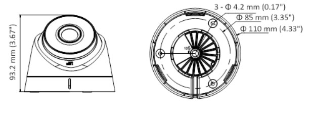 Сетевой интерфейс — RJ-45. Питание — DC 12 В и PoE (IEEE 802.3af). Потребляемая мощность — макс. 6 Вт. Размеры — Ø110×93.2 мм, вес — 0.36 кг.