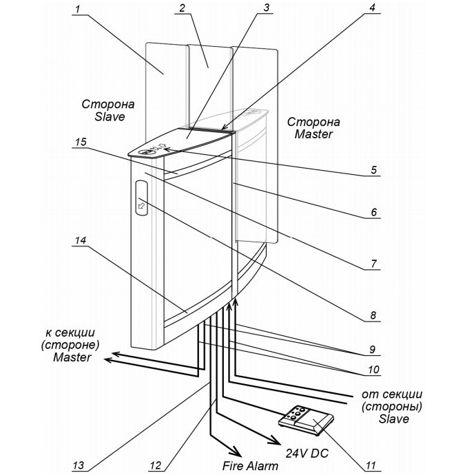 Верхний блок индикации (5) на обеих крышках секции. Он включает в себя белый индикатор (рука с картой), указывающий зону предъявления карты доступа, зеленый индикатор (стрелку), загорающийся при разрешении прохода в данном направлении, и красный индикатор (крест), загорающийся при запрещении прохода: